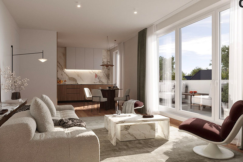 Das Gebäude öffnet sich der Sonne: Fast alle Wohnungen verfügen über Balkone oder Terrassen mit Südausrichtung, während bodentiefe Fenster die Räume mit natürlichem Licht durchfluten und ein Gefühl von Weite schaffen.