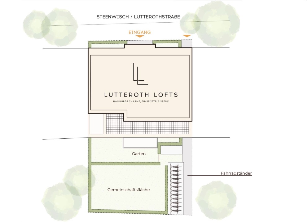 Das Grundstück auf dem die Lutteroth Lofts entstehen, vereint modernes Wohnen mit urbanem Komfort. Die Fläche ist durchdacht strukturiert: Im vorderen Bereich des Grundstücks entsteht das elegante Wohngebäude, während der hintere Teil als ruhige grüne Oase gestaltet wird. Private Terrassen und ein liebevoll angelegter Gemeinschaftsgarten schaffen eine harmonische Balance zwischen Architektur und Natur – ideal für exklusive Wohnansprüche im Herzen von Eimsbüttel.